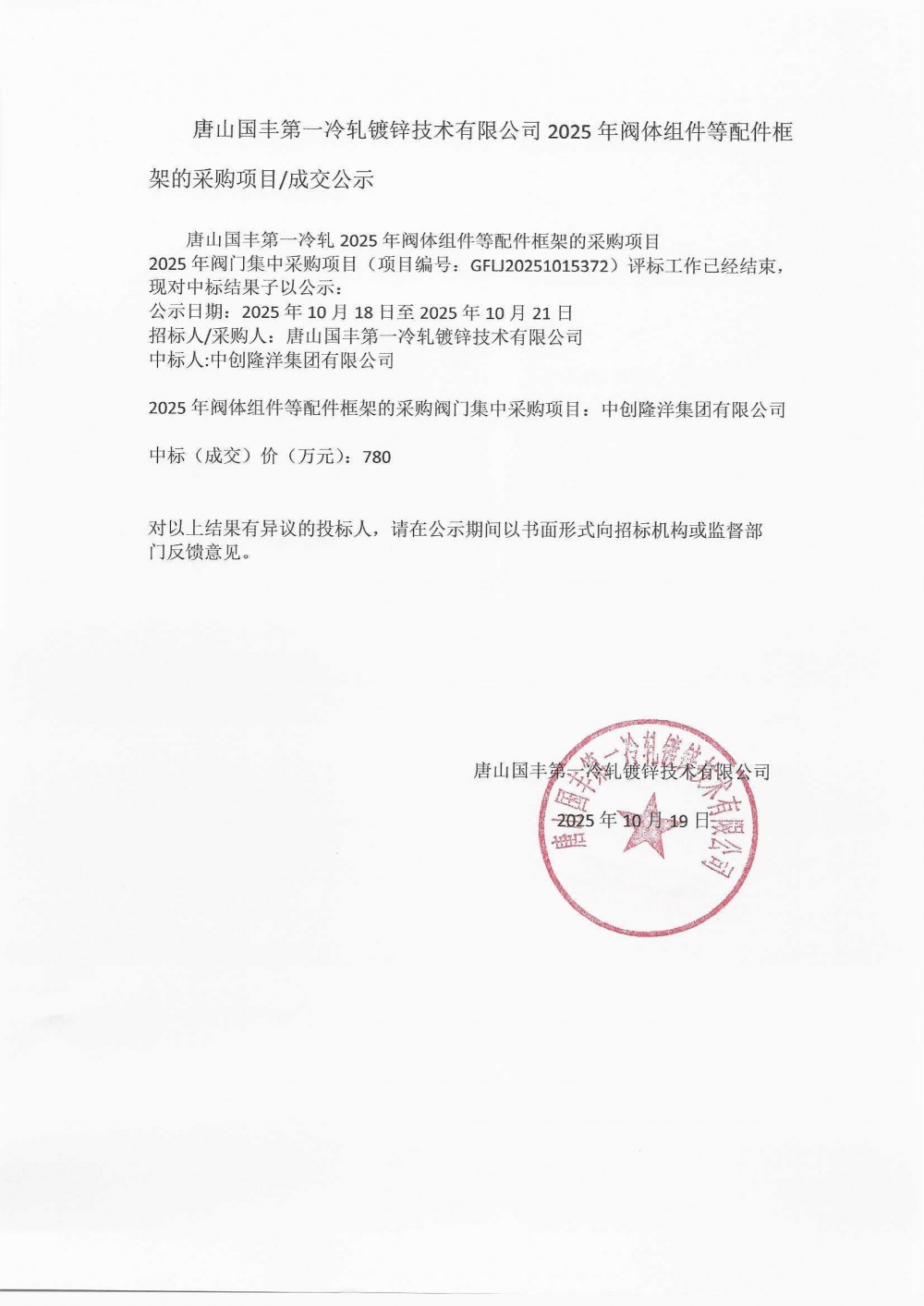 唐山国丰第一冷轧2025年阀体组件等配件框架的采购项目